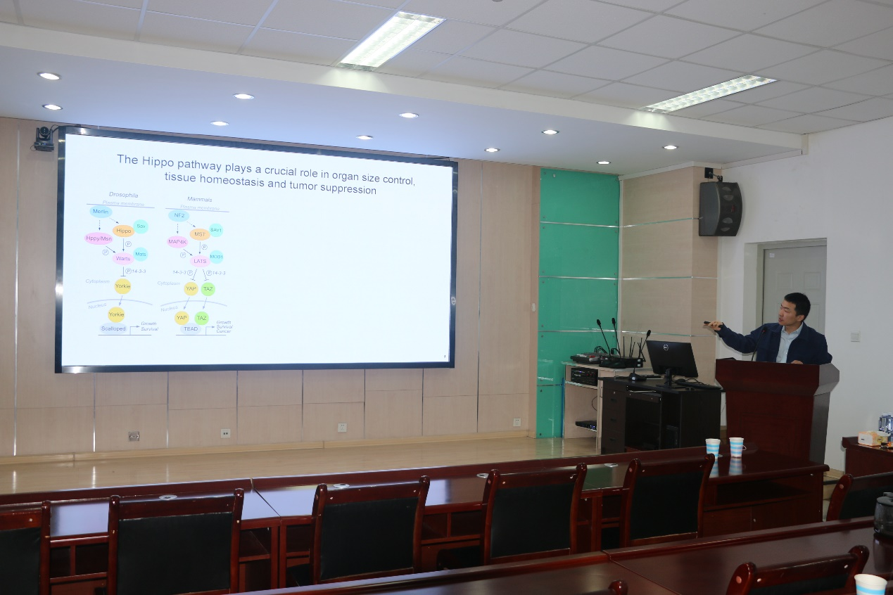 韩翰教授于2010年本科毕业于我院生物技术专业,2015年博士毕业于武汉大学,曾在加州大学欧文分校等进行博士后研究,是国家级人才计划的入选者,他长期从事Hippo通路调控领域的研究,取得了丰硕的成果。报告中,韩翰教授首先介绍了Hippo通路的基本原理和调控机制,随后重点探讨了PDL1-PA-YAP信号作用机制以及对乳腺癌细胞生长和增殖的影响以及微量元素Zn抑制MST/MAP4K介导的LATS的活性抑制Hippo通路。他指出,代谢调控与Hippo通路的相互作用是一个复杂而精密的调控网络,对于细胞稳态调控具有重要的意义。