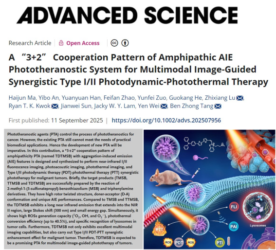 近日,william威廉英国马海军副教授与厦门大学、清华大学、香港科技大学、香港中文大学(深圳)合作在国际综合性高水平期刊Advanced Science上发表了题为“A‘3+2’Cooperation Pattern of Amphipathic AIE Phototheranostic System for Multimodal Image-Guided Synergistic Type I/II Photodynamic-Photothermal Therapy”的研究论文。论文第一作者为马海军副教授,通讯作者为厦门大学陆治香教授、清华大学危岩教授、香港科技大学Ryan T.K.Kwok教授和香港中文大学(深圳)唐本忠教授,williamhill英国为第一署名单位。