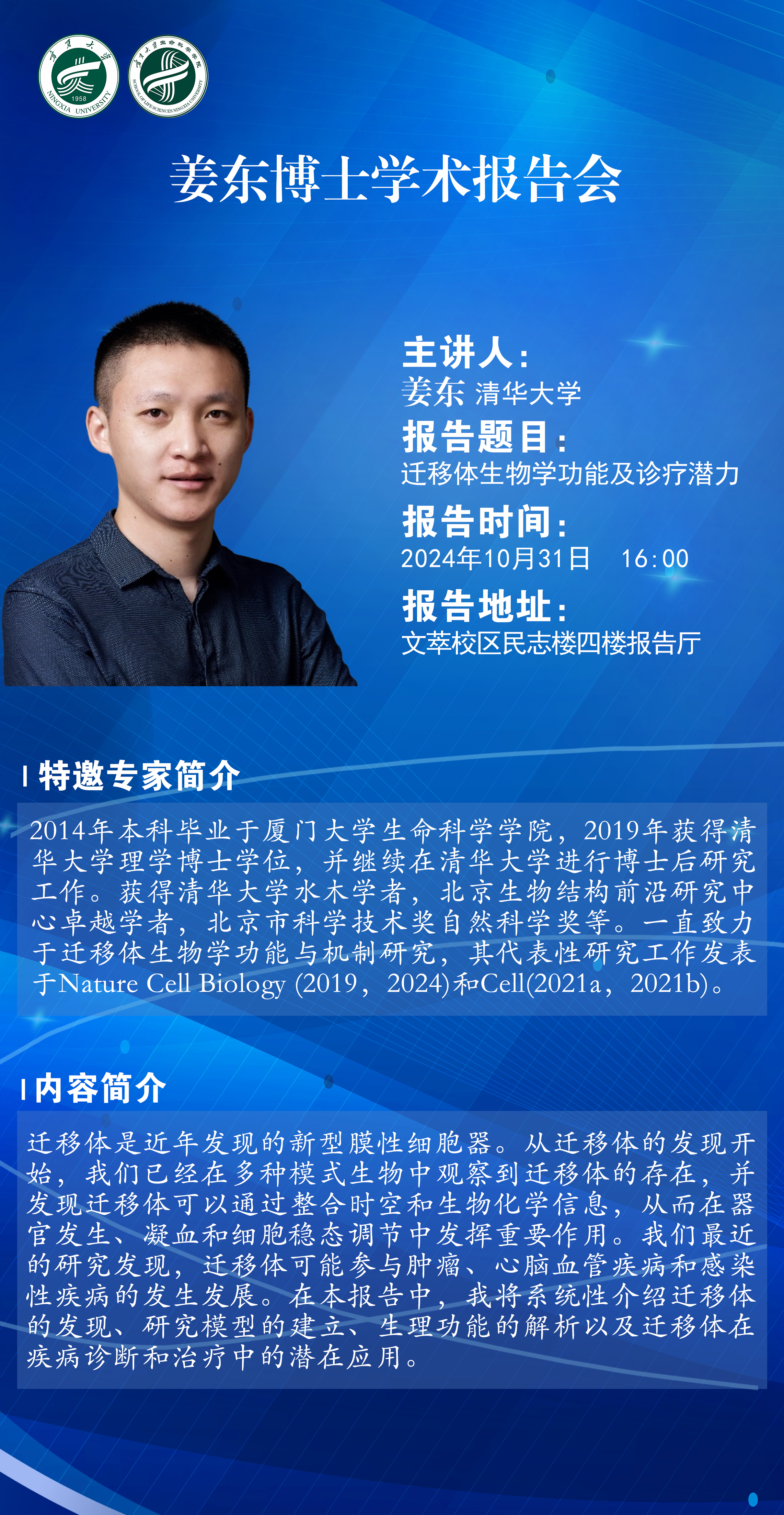 迁移体是近年发现的新型膜性细胞器。从迁移体的发现开始,我们已经在多种模式生物中观察到迁移体的存在,并发现迁移体可以通过整合时空和生物化学信息,从而在器官发生、凝血和细胞稳态调节中发挥重要作用。我们最近的研究发现,迁移体可能参与肿瘤、心脑血管疾病和感染性疾病的发生发展。在本报告中,我将系统性介绍迁移体的发现、研究模型的建立、生理功能的解析以及迁移体在疾病诊断和治疗中的潜在应用。