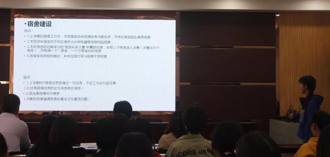 最后,叶志春副书记、何彦平副书记对本次班级量化考核进行了点评。叶志春副书记提到上学期各个班级都有明显进步,表现在挂科少、旷课少、事假少、四六级通过率高、到课率高及宿舍评优率高等方面。何彦平副书记从增强公寓安全意识、加强课堂行为规范、注重外出安全及班级考核汇报表现中出现的问题等方面进行了点评并提出了更高的要求。