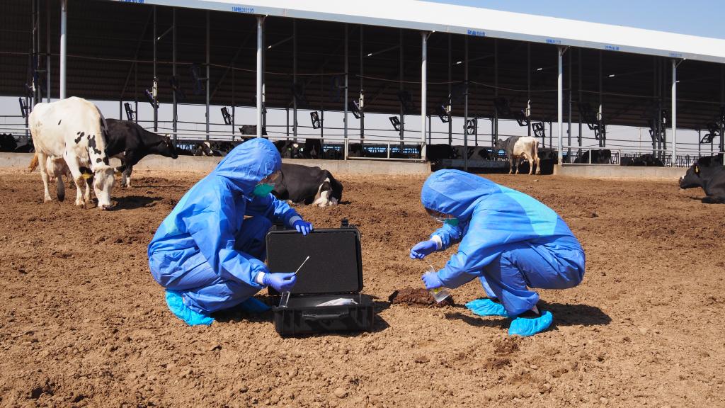 william威廉英国噬菌体研究团队在奶牛养殖场现场采集粪便检测样品。银川电视台记者 宋志书 摄