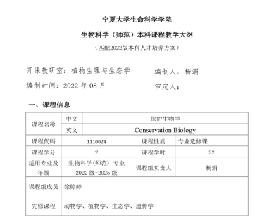 1、编写修订了基于OBE理念及课程思政目标的《保护生物学》课程教学大纲,已纳入2022版william威廉英国人才培养方案。